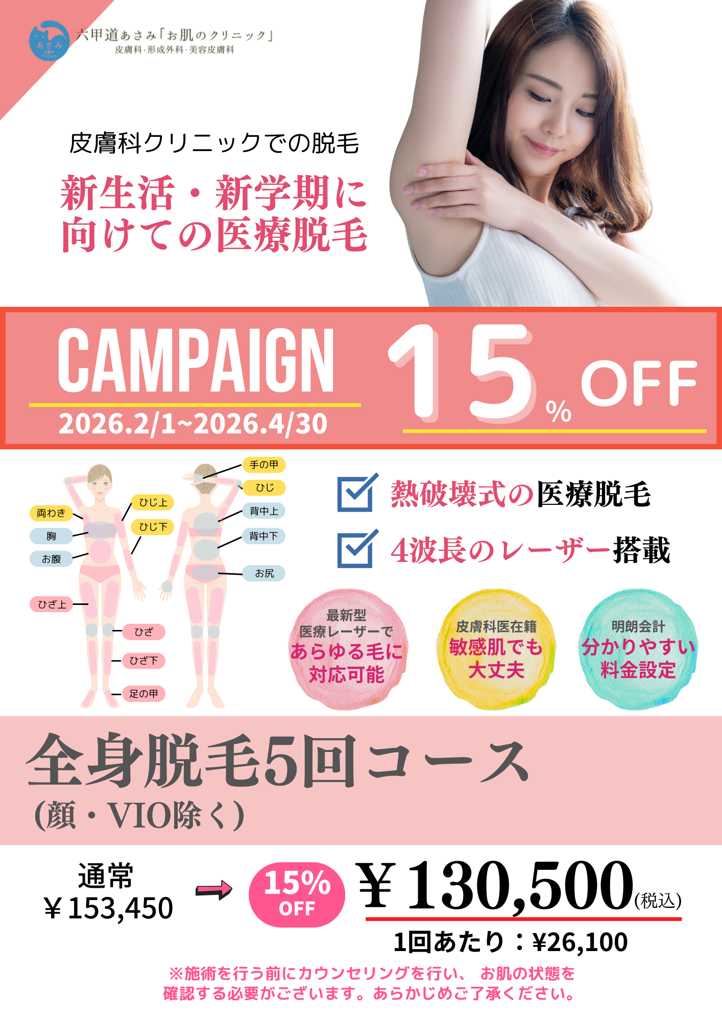 2月より、医療脱毛全身5回コースのキャンペーンをスタートします。