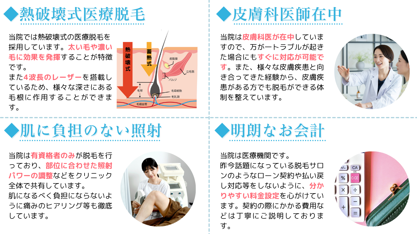 患者様お一人お一人の肌の状態に合わせた最適な設定で安全に脱毛施術を行うことができます。