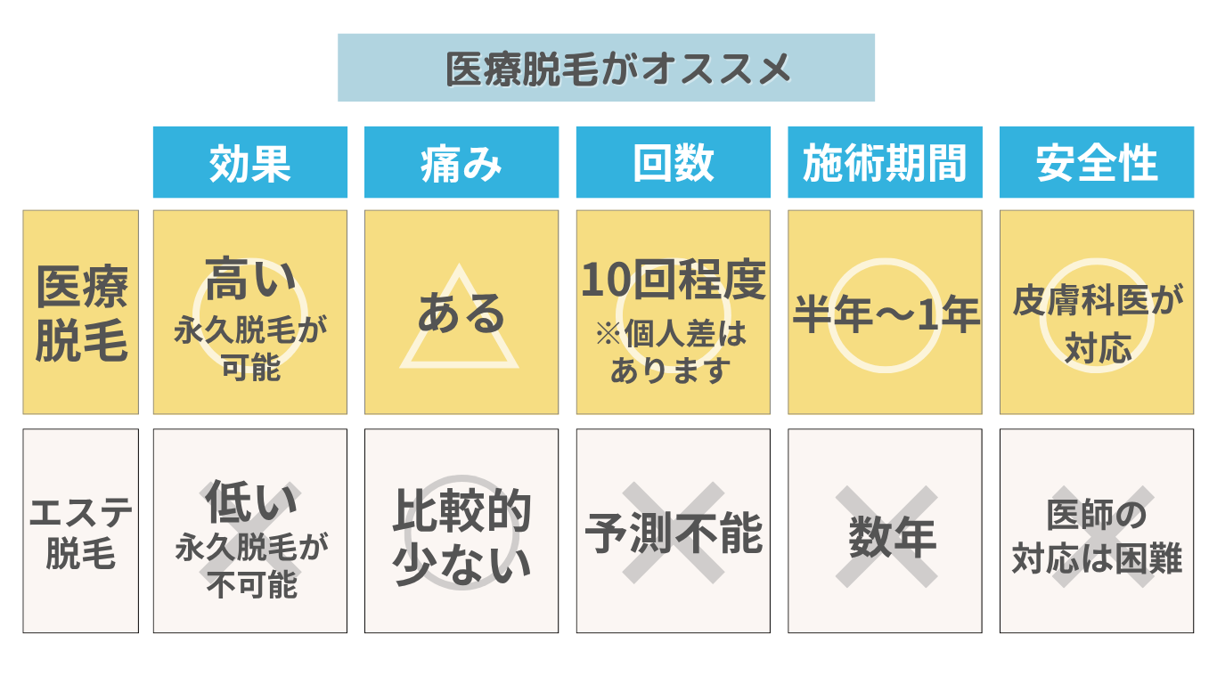 つまり、医療レーザー脱毛はエステ脱毛よりも高い効果があり
