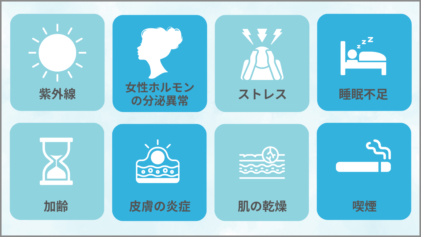 女性ホルモンのバランス変化・慢性的な炎症・肌への過度な摩擦・ストレスや睡眠不足などの生活習慣の乱れも、